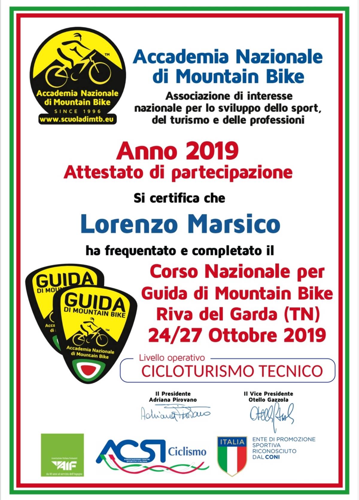 Dopo diversi anni in sella alle MTB, portando in giro amici e persone appassionate di questo sport, ho deciso di prendere una qualifica diplomandomi presso l'Accademia Nazionale di MTB.